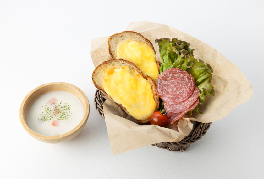 大自然に囲まれた山小屋でのランチタイムをイメージ。トロッとチーズの乗ったライ麦パンのトーストと、身体あたたまる優しいミルクスープのセット。