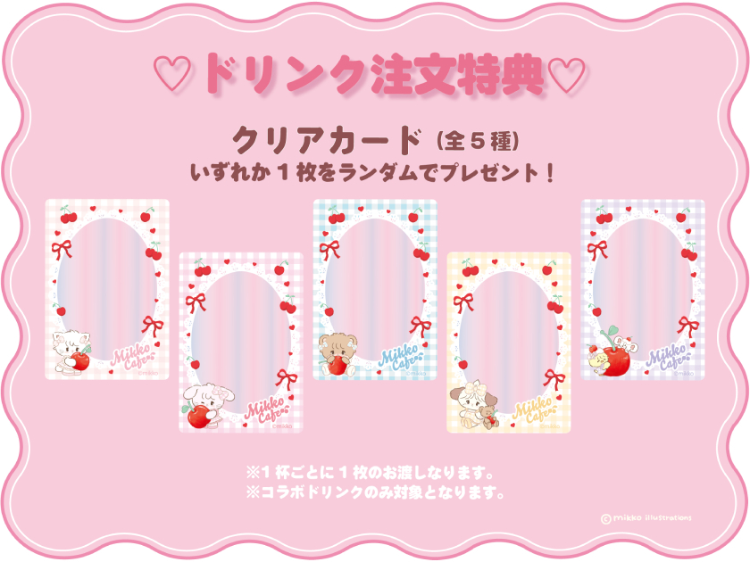 ドリンク注文特典:カフェでコラボドリンクを注文した方に「クリアカード(全5種)」をランダムで1つプレゼント。