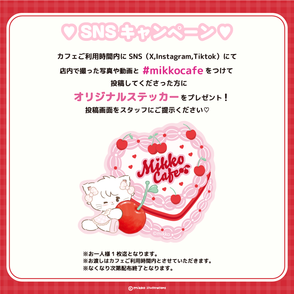 SNSキャンペーン:カフェ利用時間内にSNS(X,Instagram,Tiktok)にて店内で撮った写真や動画に「#mikkocafe」をつけて投稿した方に「ステッカー(全1種)」をお1人様につき1枚プレゼント! ※無くなり次第終了