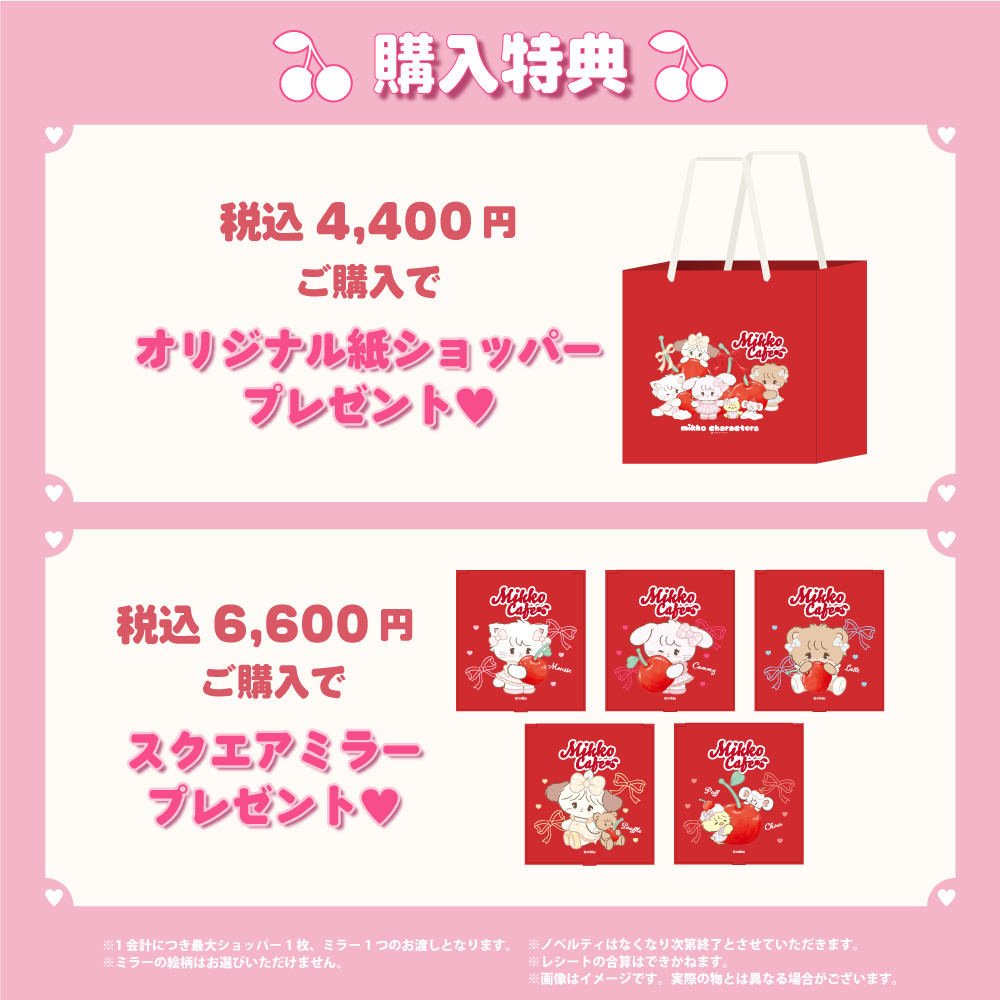 物販購入特典:カフェで、オリジナルグッズを4,400円(税込)以上購入した方に「オリジナル 紙製ショッパー」を1枚プレゼント。6,600円(税込)以上購入した方に「スクエアミラー」を1点プレゼント。