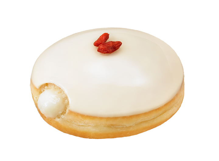 杏仁豆腐の甘く柔らかな味わいを楽しめる、アジアンドーナツ。トゥルンとした口あたりの杏仁が香るクリームを入れて、ツヤツヤの杏仁風ナパージュでミルキーなホワイトチョコをつつんだよ。クコの実のトッピングがアクセント!