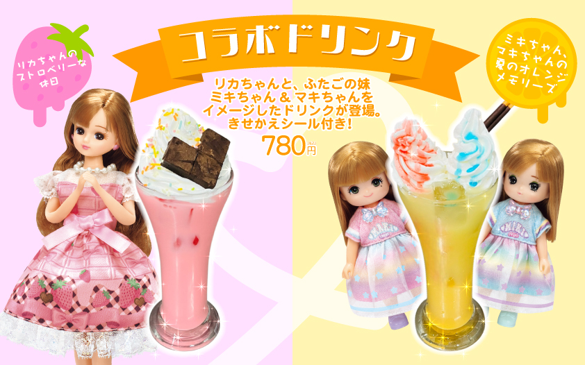 リカちゃんとふたごの妹、ミキちゃん&マキちゃんをイメージした2種類の可愛いドリンクが登場。