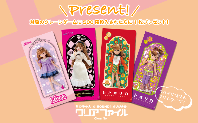 「リカちゃん」コラボプライズを含む対象のクレーンゲームにプレイ料金500円を投入すると、先着でオリジナルクリアファイルがもれなくもらえる☆