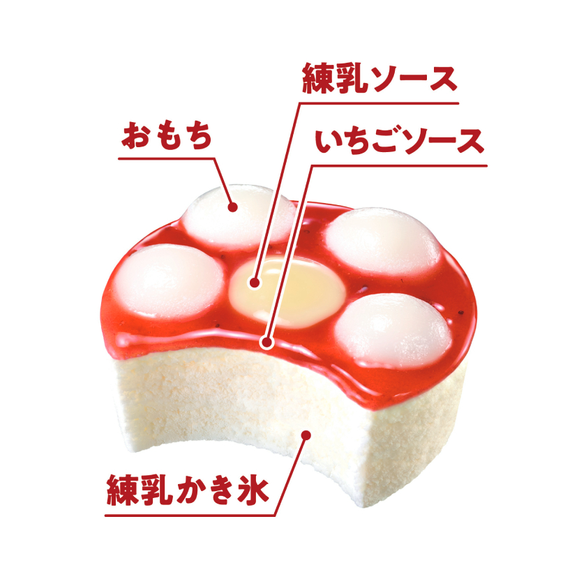 練乳かき氷の上にフレッシュないちごソースとおもち、練乳ソースをトッピングした4層構造で、定番人気のいちご×練乳のかき氷を再現。まるで甘味処で食べる本格的なかき氷のような味わいを手軽に楽しめる♡