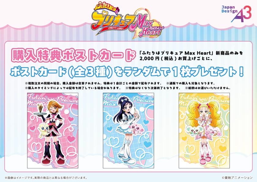 「ふたりはプリキュア Max Heart」の商品2,000円(税込)お買い上げごとに、ポストカード(全3種・ランダム)をプレゼントします。