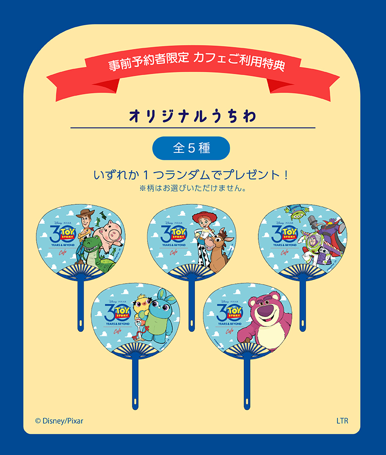 ①事前予約者限定 カフェ利用特典:事前予約(770円(税込)/1名)を利用し、メニューを注文した方に「オリジナルうちわ(全5種)」をランダムに1枚プレゼント。