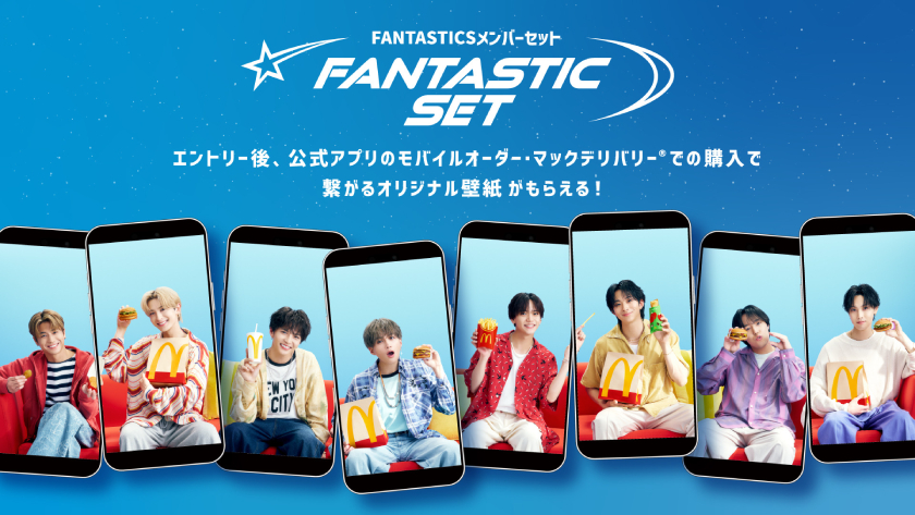 マクドナルド公式アプリのFANTASTIC STATIONからエントリー(初回のみ)後、公式アプリからモバイルオーダー・マックデリバリーサービスで「FANTASTIC SET」のうち各メンバーのセットを1回以上ご注文・ご購入いただくことで、当該メンバーのスペシャルウォールペーパーのダウンロードが可能になります。8つの壁紙を合わせると、1つのつながる画になります。