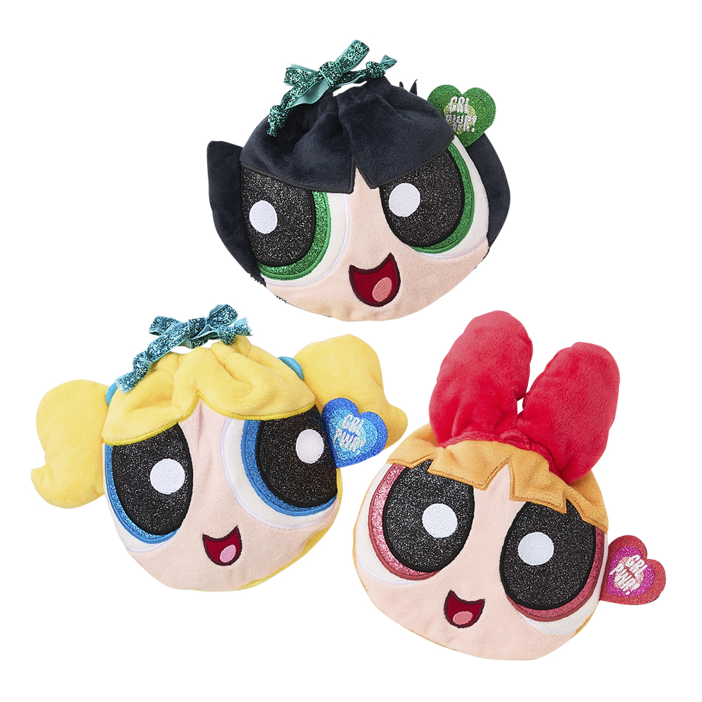 PLAZA・MINiPLA限定!ポジティブで正義感が強い「ブロッサム」、可愛いものが大好きな「バブルス」、おてんば娘の「バターカップ」の3人の女の子が活躍する「THE POWERPUFF GIRLS(パワーパフ ガールズ)」のフェイス巾着。キラキラのラメがとってもキュート♪
