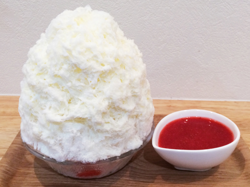 氷全体に練乳をふんだんに使い二層目に生の角切りのいちごとフレッシュいちごシロップを内蔵。 さらに、大きめのピッチャーにフレッシュいちごシロップを付属。