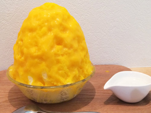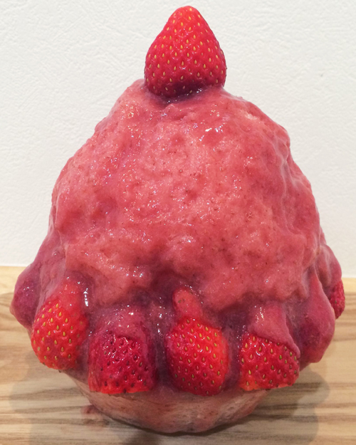旬が短い山形県西村山郡河北町の佐藤錦(さくらんぼ)をボトムに10個(種抜き)、ミドルに5個(種抜き)、トップに7個(種あり)と、生のさくらんぼを22個使用した贅沢なかき氷。