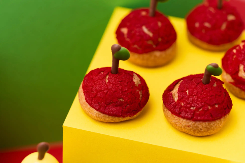 ハローキティの大好物であるアップルパイをパフェとして仕上げた、新感覚のウェルカムデセール。りんごゼリー、カスタードクリーム、りんごのソテーを重ね、さくさくのパイの上にはりんごのムースを可愛らしく飾りつけ。