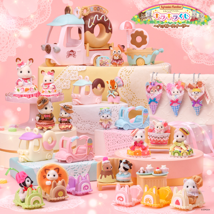 2025年の「シルバニアファミリー キラキラくじ」のテーマは「ハッピースイーツ」。シルバニアファミリーのお人形が、ケーキやクレープなどをモチーフとした可愛いコスチュームを着ているよ。A賞のドーナツワゴンとE賞、F賞のスイーツカーはつなげることができるので、たくさん集めて楽しもう♪