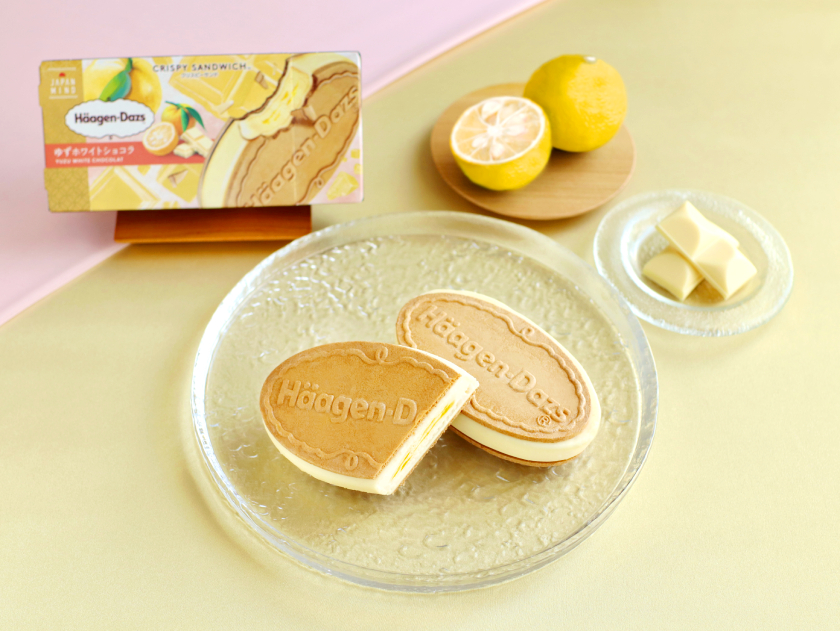 本商品は、伝統的ながらも洗練された日本のよさを、ハーゲンダッツならではの感性で表現した新プロジェクト「JAPAN MIND(ジャパン マインド)」の第3弾商品。今回は人気の「和素材」の中から、日本を代表する香酸柑橘(※1)である「ゆず」に着目。爽やかな味わいのゆずを相性の良いホワイトチョコと組み合わせた、スイーツ仕立てのクリスピーサンド♪