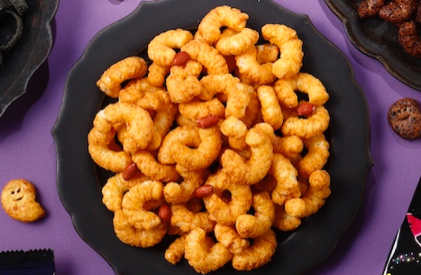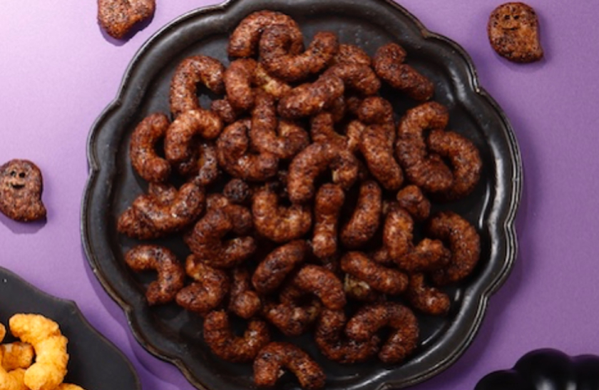 ブラックココアを加えて黒い生地にした、ハロウィン限定フレーバー「ブラックキャラメルコーン・魅惑のショコラ味」は、カカオの香りとともに、れん乳のまろやかな甘みを感じられる味わいに仕上げたよ。おなじみの形のキャラメルコーンに混ざって、おばけの形をしたキャラメルコーンが入っているかも!?