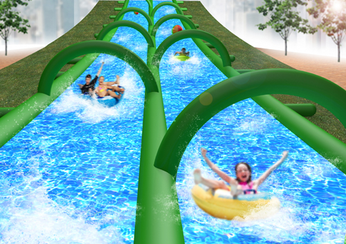 ハイドロプレーニング現象とは、雨天時の車の高速走行において、車のタイヤと路面の間に水が入り込み、止まることもコントロールすることもできなくなる現象で、ハイドロスライダーは、この現象を活用したウォータースライダーで、生身で止まらない恐怖とコントロールできない面白さを120mに及ぶコースで、ぶっ飛ぶように楽しむアトラクション。