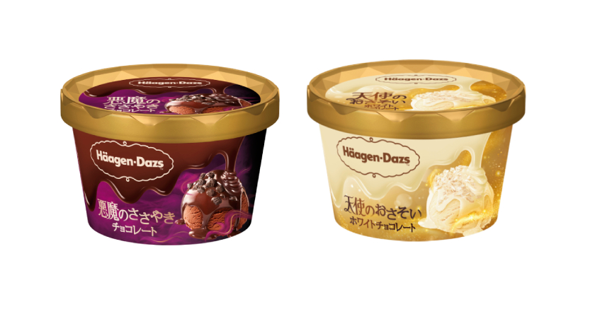 ハーゲンダッツ ミニカップ 悪魔のささやき『チョコレート』、 天使のおさそい『ホワイトチョコレート』が期間限定で新発売!とろーりとしたバターココアソースや、ホワイトチョコソースが楽しめる♡