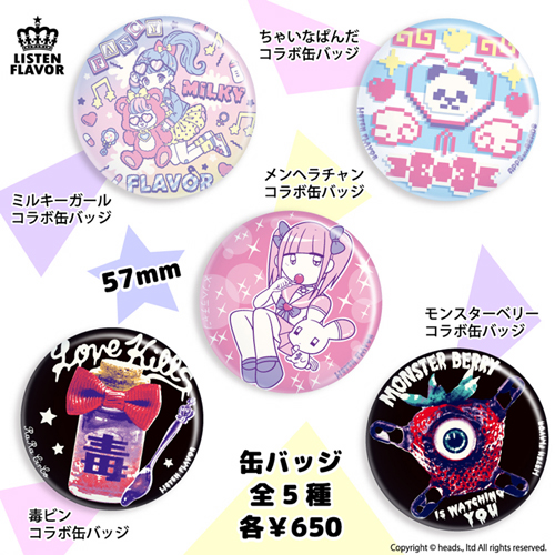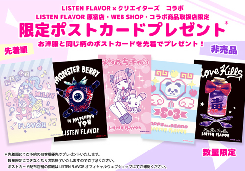 本コラボアイテムは、原宿女子に絶大な人気を誇るメンヘラチャンをはじめ、ファンシーサプライズ、Apps and Beads、RaRa-CirCo、MONSTER BERRYの5人のクリエイターがリッスンフレーバーの可愛さをよりパワーアップさせたとっておきのデザイン揃い。