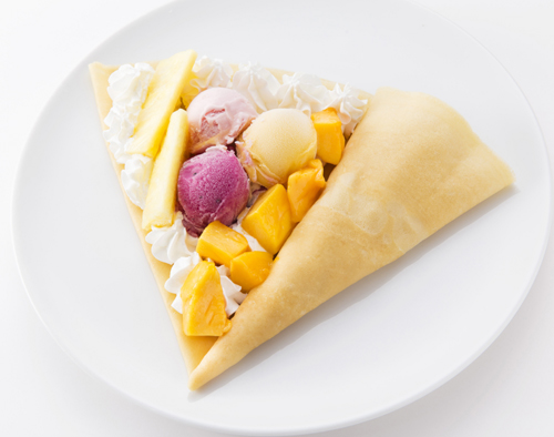 南国のカラフルなフルーツをポップにイメージ。ピタヤ(ドラゴンフルーツ)アイスに、マンゴシャーベット、ストロベリーアイスとマンゴフルーツ、生クリーム、パイナップルをアクセントにしたまさにカーニバルなクレープ。