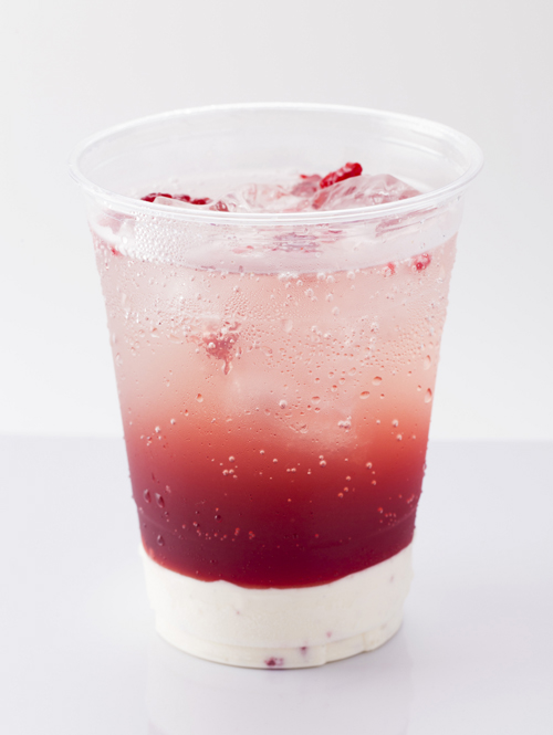 深いルビーレッドの色で見た目も美しく、むくみ改善や美肌効果もあるオレンジの風味で香り豊かなブラッドオレンジティーをシロップにし、炭酸で割りました。限定のBIGサイズカップの底にはラズベリー入りバニラアイス。つぶつぶ食感や新感覚を楽しめる甘酸っぱいドリンク。