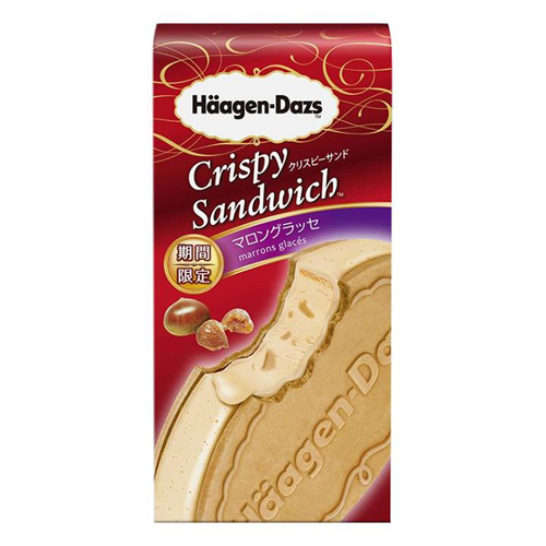 クリスピーサンド「マロングラッセ」は、しっとりと柔らかい食感のイタリア産のマロン粒を混ぜ込んだ風味豊かなマロンアイスクリームを、ほんのりとラム酒が香るマロンコーティングで包み込み、ウエハースでサンド。秋を感じるスイーツ「マロングラッセ」の味わいをクリスピーサンドで楽しんで。