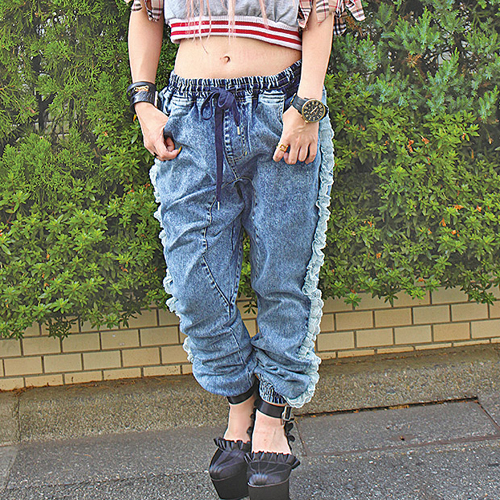 ケミカル加工のカジュアルさとサイドレースのキュートさとのバランスが絶妙的。ウエスト&ヘムのゴムデザインが自分らしくアレンジ可能。バックのローズプリントのワンポイントがオシャレ心をくすぐられちゃう。