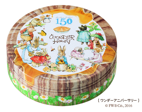 ワンダーハニーの世界に集まったピーターラビット™と仲間たちのにぎやかな様子が楽しいビック缶のスペシャルなアニバーサリーアイテム。