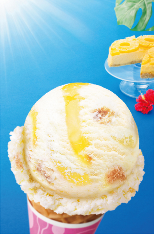 沢山あるサーティワンのフレーバーの中でも特に人気の高いチーズケーキのフレーバー。定番のストロベリーチーズケーキをはじめ、これまで様々なチーズケーキフレーバーが誕生し好評だったことから、濃厚チーズケーキにさわやかなパイナップルのアクセントを加えた夏フレーバーに。