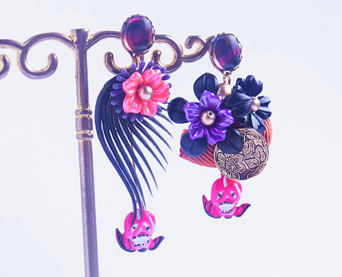 西ドイツ製のヴィンテージプラスチックのお花と、ユーモラスなゴーストが揺れる、アシンメトリーピアス。不思議な色がゆらめる。