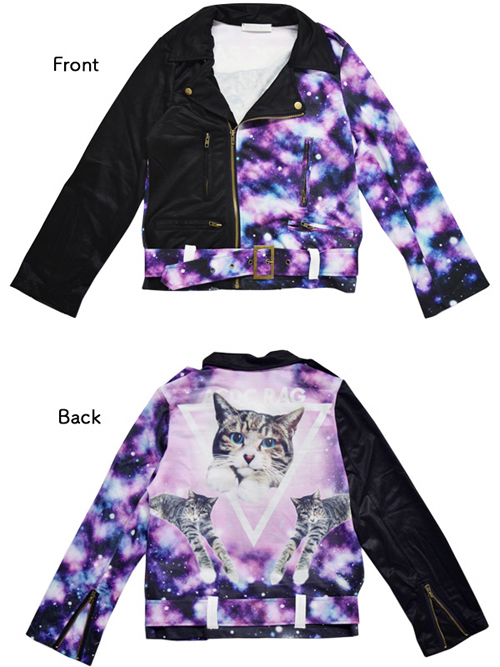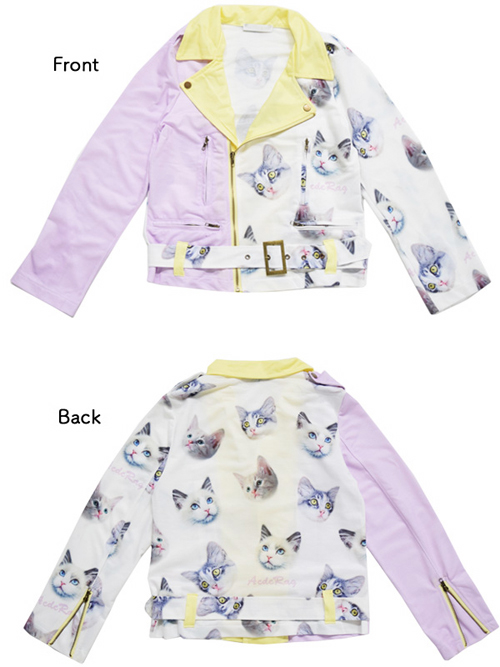 ライダースだけど、ゆるく、可愛らしく着たい!を実現したホワイト&ラベンダー&イエローの未だかつてない、美しいパステルカラーの組み合わせ。素材も柔らかく、クタッとした質感だから、よりパステルが際立つ。そこにキュートなニャンコたちがいっぱいデザインされてるから、言う事無しでキュート系にまとめられるね!