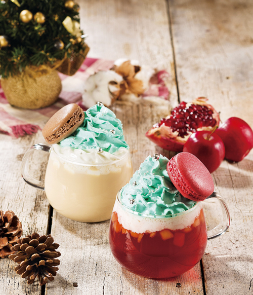 前回秋限定として紫いもを使用し、色鮮やかな見た目をも凌駕する焼き芋がトッピングしたドリンクの次なる限定ドリンクとしてなんとも色鮮やかなクリスマスカラーのプレミアムティー2種類。 「プレミアムざくろミントティー with ストロベリーマカロン」は、ざくろの甘酸っぱさが生きたざくろティーに、アクセントとして、しゃきしゃき感が楽しいリンゴを浮かべました。トッピングとして、生クリームの上にこんもりと山型にミントホイップを盛り付け、その上に銀色のアラザン、さらに大胆にもストロベリーのマカロンを丸々1つ乗せることで、まさにクリスマスツリーのようなプレミアムなドリンクに仕上げている。