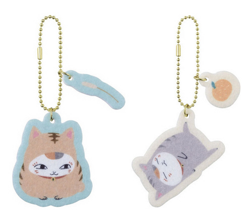 ボールチェーンつきの約10cmの着ぐるみマスコット。グレー、黒猫、三毛猫の3種類から好きなのが選べるよ。