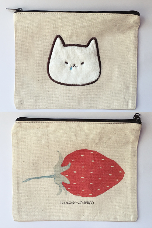 表面<ボア生地使用のにゃんこorみーこの顔>はすべて違う1点もの。裏面は全てイチゴイラスト。