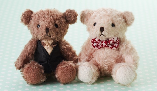 ネクタイとベストをまとったココアと、ツイード風の蝶ネクタイを着けたミルクティー。磁石が入った手は近づけるとお手手を繋げられるよ!