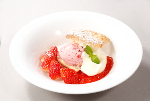 なめらかな口当たりのプリンに、苺ムースとホイップクリームを添えたプリンアラモード。食後にちょうど良いサイズのデザート。