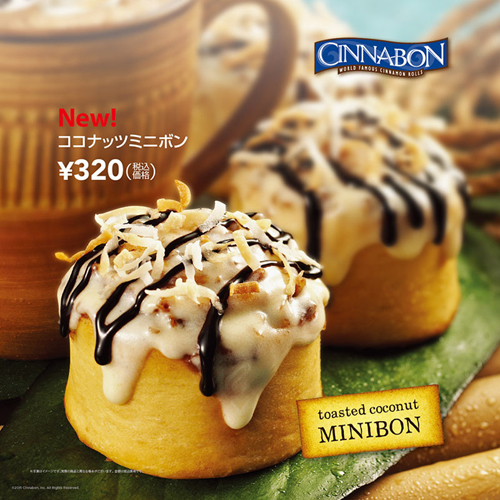 ココナッツミニボンは、スーパーフードとも称されるココナッツをふんだんに使用した特製のココナッツペーストを、シナボンのもちもち生地でロールし焼き上げた。仕上げに、クリームチーズフロスティング、チョコレートソースと、ローストココナッツシュレッドをトッピング。※本商品には、シナモンは含まれていません。
