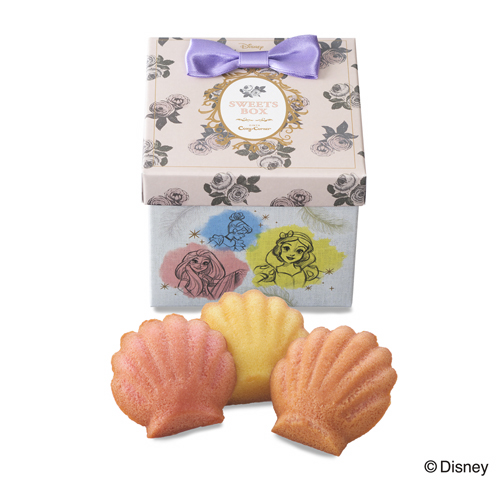 ディズニープリンセスをデザインしたかわいいパッケージの中には、プレーン、いちご、ももの3つの味わいのマドレーヌ入り。