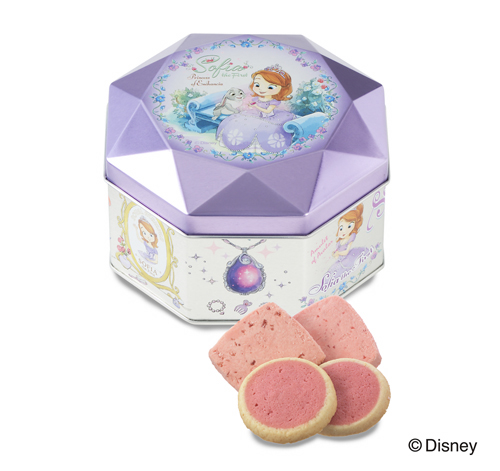 コージーコーナーのスイーツギフト初登場の「ちいさなプリンセス ソフィア」をデザインしたギフト缶。ソフィアが大切にしている、紫色のペンダントをイメージした缶の中に、いちごの焼きショコラとフランボワーズクッキー入り。