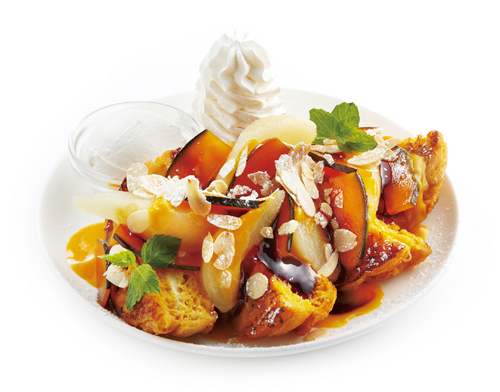 秋と言えばほっくほくのかぼちゃの季節。マスカルポーネをサンドし、カボチャのアパレイユで焼き上げたフレンチトーストに、かぼちゃソース&カラメルソースをかけ、かぼちゃ、洋梨のコンポート、スライスアーモンドで飾った、鮮やかなパンプキン色が食欲をそそる。※写真はレギュラーサイズ。