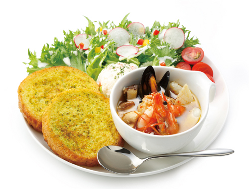 福岡本店限定には、昨年好評だったアヒージョをシーフードメインにリニューアル。バジルの香りたっぷりのフレンチトーストに、シーフードたっぷりのアヒージョが良く合います。アヒージョには、有頭エビ、ホタテ、ムール貝などの魚介類とマッシュルーム、エリンギのキノコを入れて仕上げている。※写真はフレンチトースト2枚。