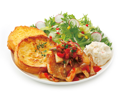 ビックサイズのチキンをタイム、ローズマリー、にんにくのハーブバターソースでソテーし、エリンギ、マイタケのキノコとトマトでデコレーション。ハーブとキノコの香りが食欲をそそり、フレンチトーストとの相性も抜群。※写真はフレンチトースト2枚。