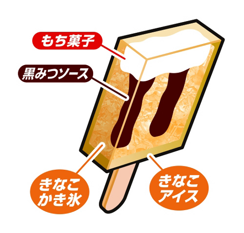今回の新商品は、 きなこ味のキャンディーの中に、先端にもち菓子、さらに黒みつソースときなこかき氷が入ったアイスキャンディー。もち菓子のインパクトはそのままに、国内で注目度の高い山梨県のお土産ブランド「桔梗屋」監修を受けたお墨付きの味。