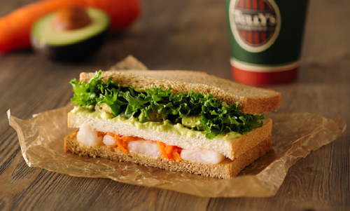王道の「エビ」と「アボカド」の組み合わせに、フレッシュ野菜を柑橘系ドレッシングでサラダ仕立てにしたサンドイッチ。※一部の地域では取扱いがございません。