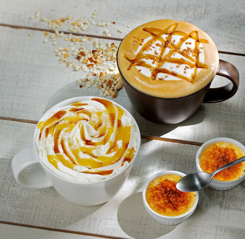 「バニラクレームブリュレラテ」は、マダガスカル産バニラビーンズ入りのカスタードソースを使用し、「クレームブリュレ」をモチーフにしたドリンク。メープルとカソナード(ブラウンシュガー)で、焦がしたカラメルの香ばしさと食感を表現。