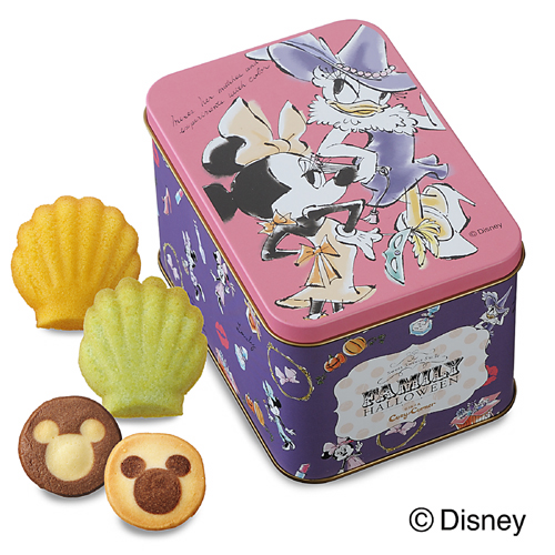 マドレーヌとミッキーのシルエット柄クッキーを、ミニーとデイジーがデザインされたハロウィンバージョンの缶の中に詰め合わせました。