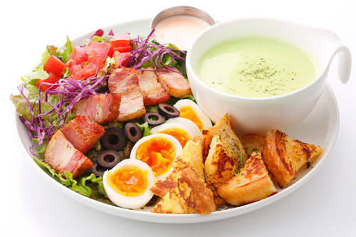 たっぷりのサラダにホエー豚のベーコン・トマト・ ゆで卵・オリーブをトッピング。 風味豊かに仕上げたオリジナルコブサラダドレッシングをかけて。さらに、添えられたそら豆のポタージュは優しい味に仕上げている。