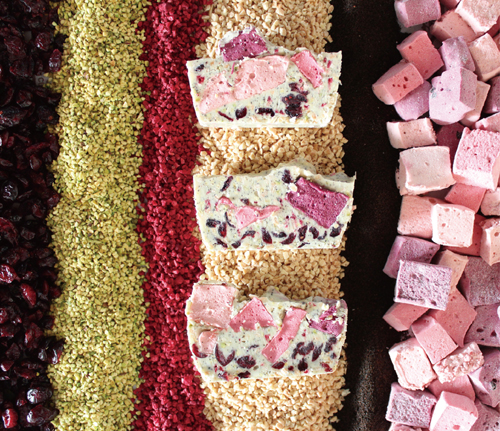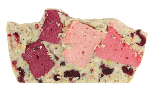 ベリーティーをイメージしたロッキーロード。赤い果実、アールグレイの茶葉、マシュマロなど、エレガントなマリアージュが楽しめるチョコレート菓子に仕上がっている。