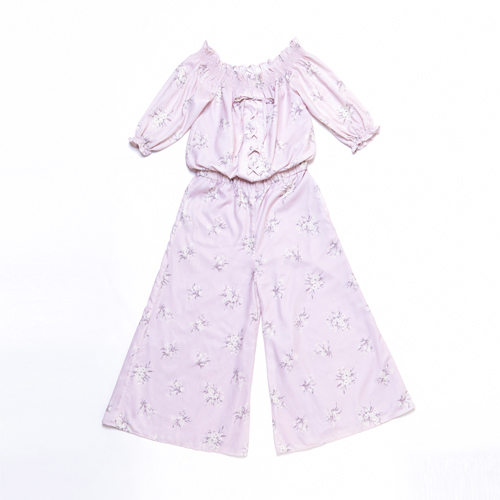 オリジナルのエンブロイダリーフラワープリントをオフショルに仕上げ、今年らしいリラックスしたシルエットに。ワイドなパンツとフロントのレースアップもポイント。