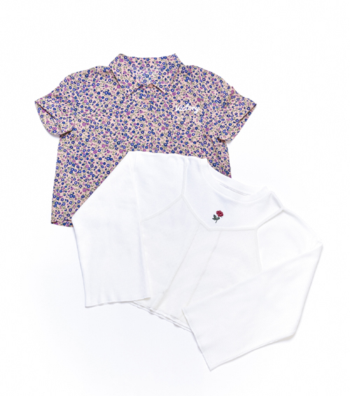 花柄でガーリーに仕上げたボーリングシャツと、jouetieならではのローズ刺繍をカジュアルなサーマル素材に落とし込んだトレンドのワイドスリーブ。