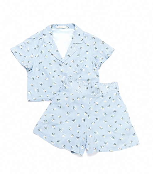 オリジナルの小花柄のレーヨン生地にプリントして古着っぽい印象に、開襟のデザインでレトロ感を出したセットアップ。トップはショート丈、キュロットはハイウエストで、ウエストがちら見えするデザイン。
