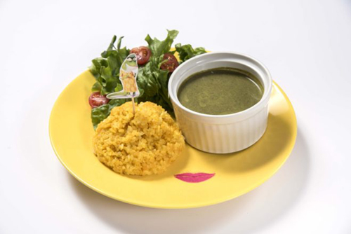 おっちょこちょいのミスクローリーサラダの中には…!? 口紅がワンポイント!ホウレンソウペーストの入った辛くないグリーンカレー。まるでみんなに優しいミスクローリーのようです。
